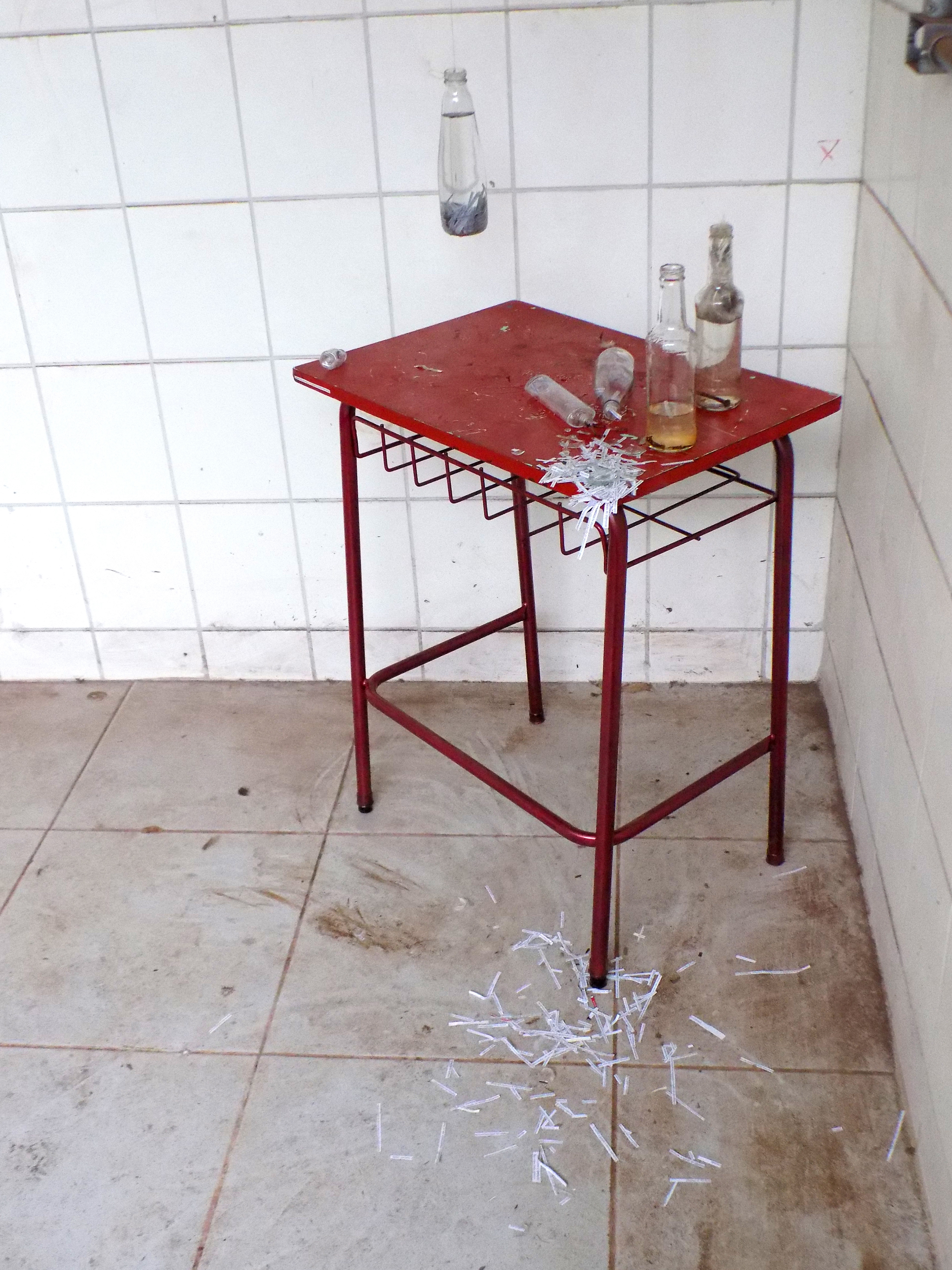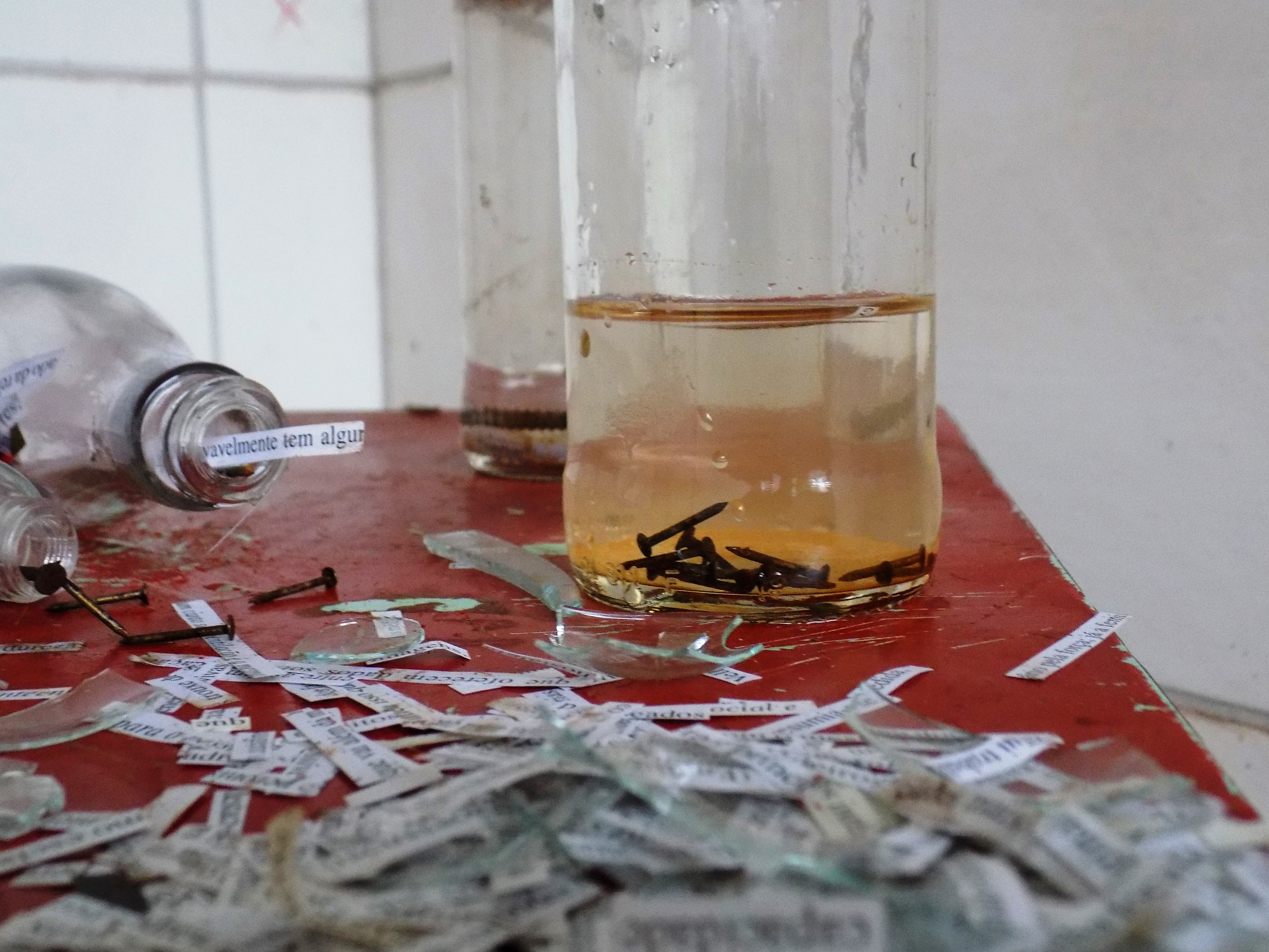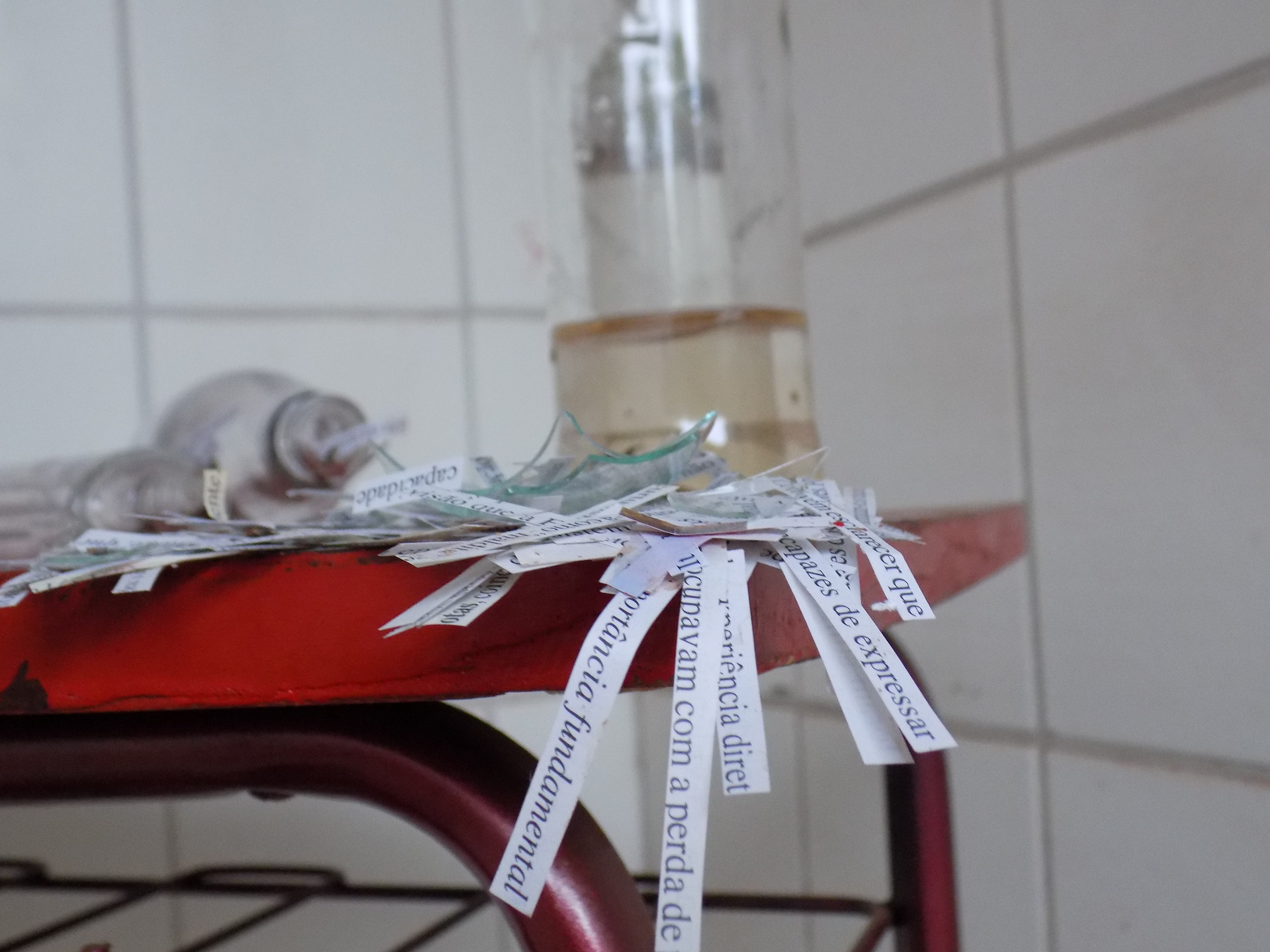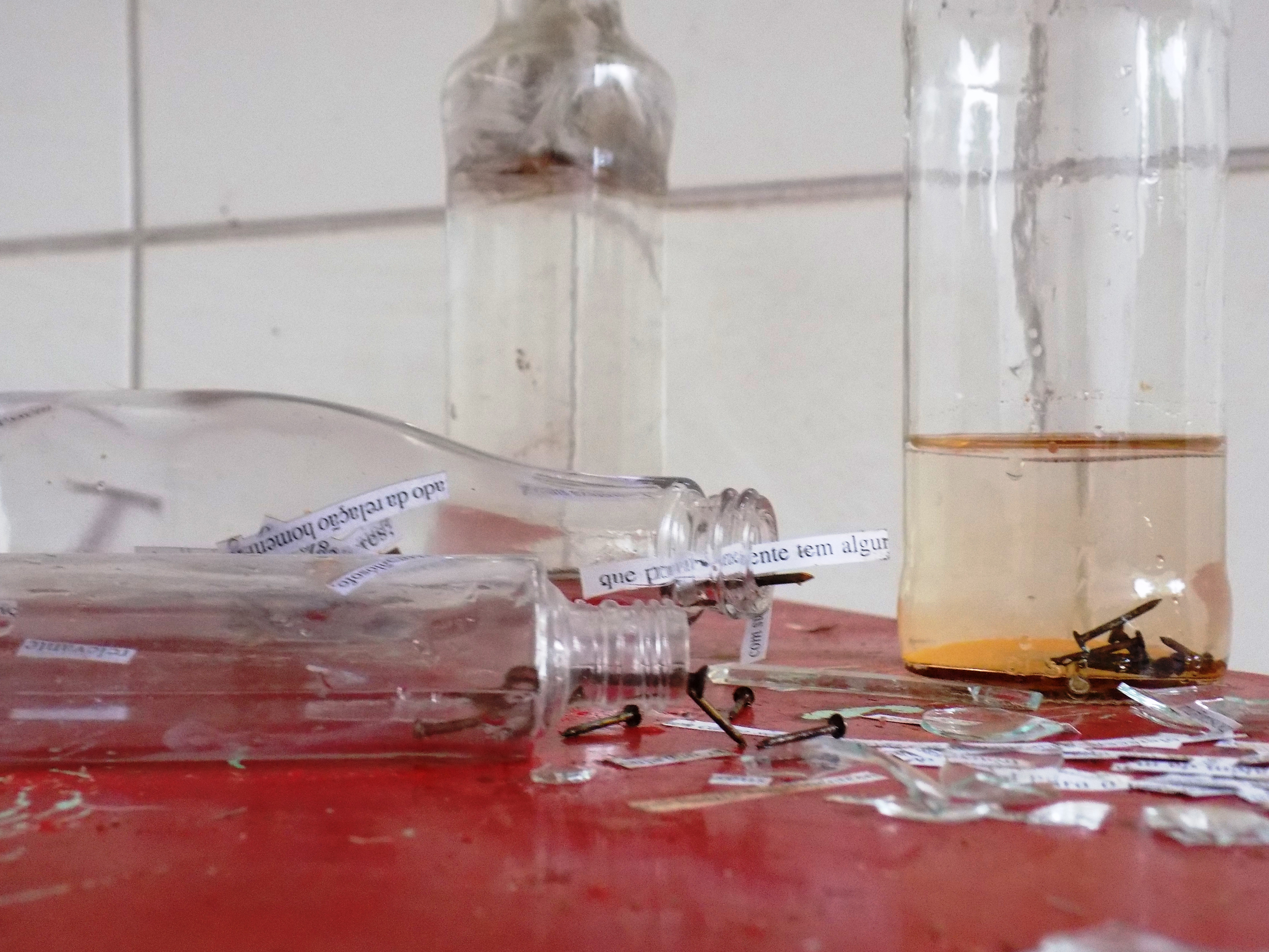 ESPAÇO DESABITADO, MESA, ARAME, GARRAFAS, ÁGUA, PENA, PREGO, ARAME, CACO DE VIDRO, PALAVRAS