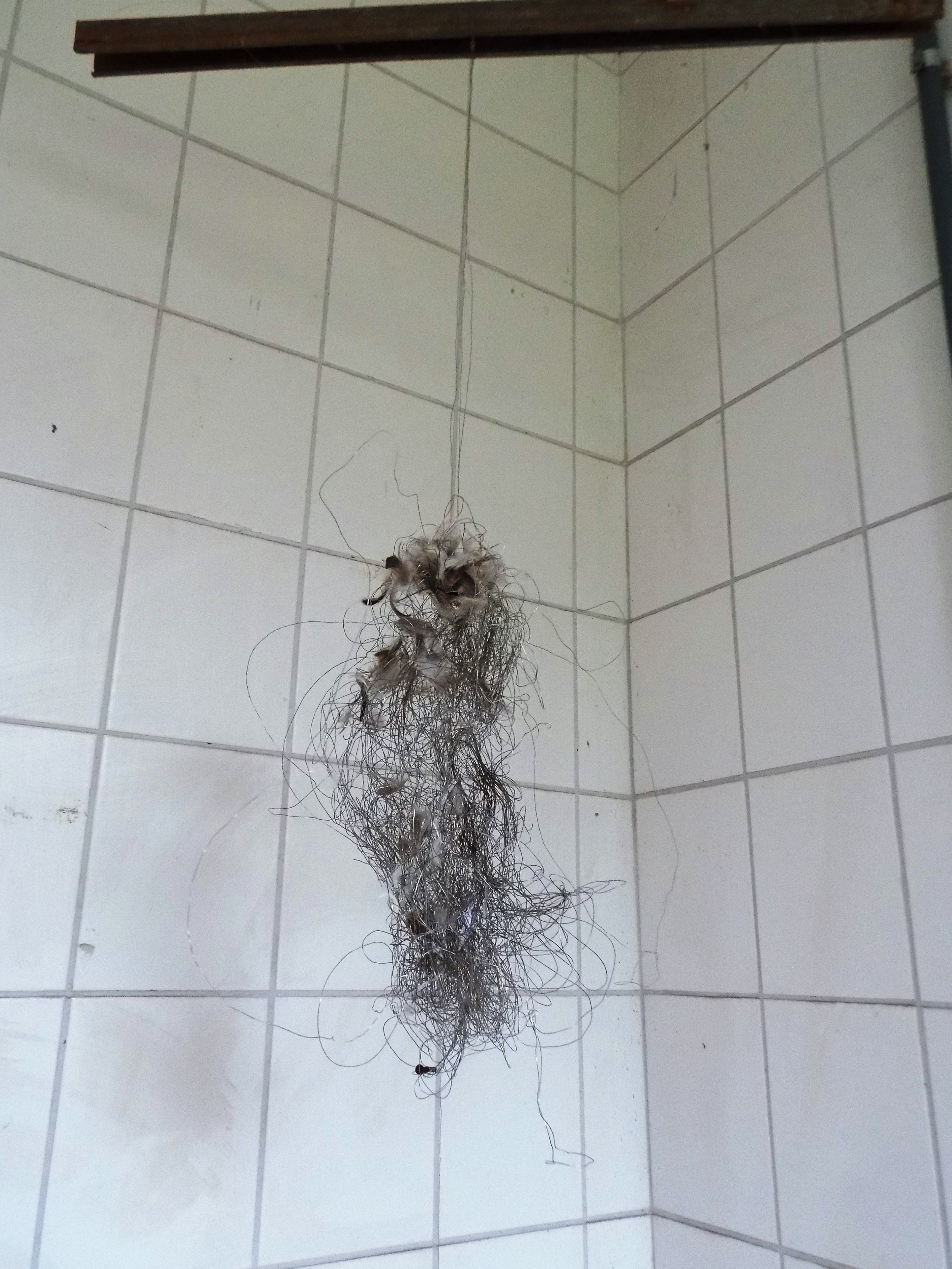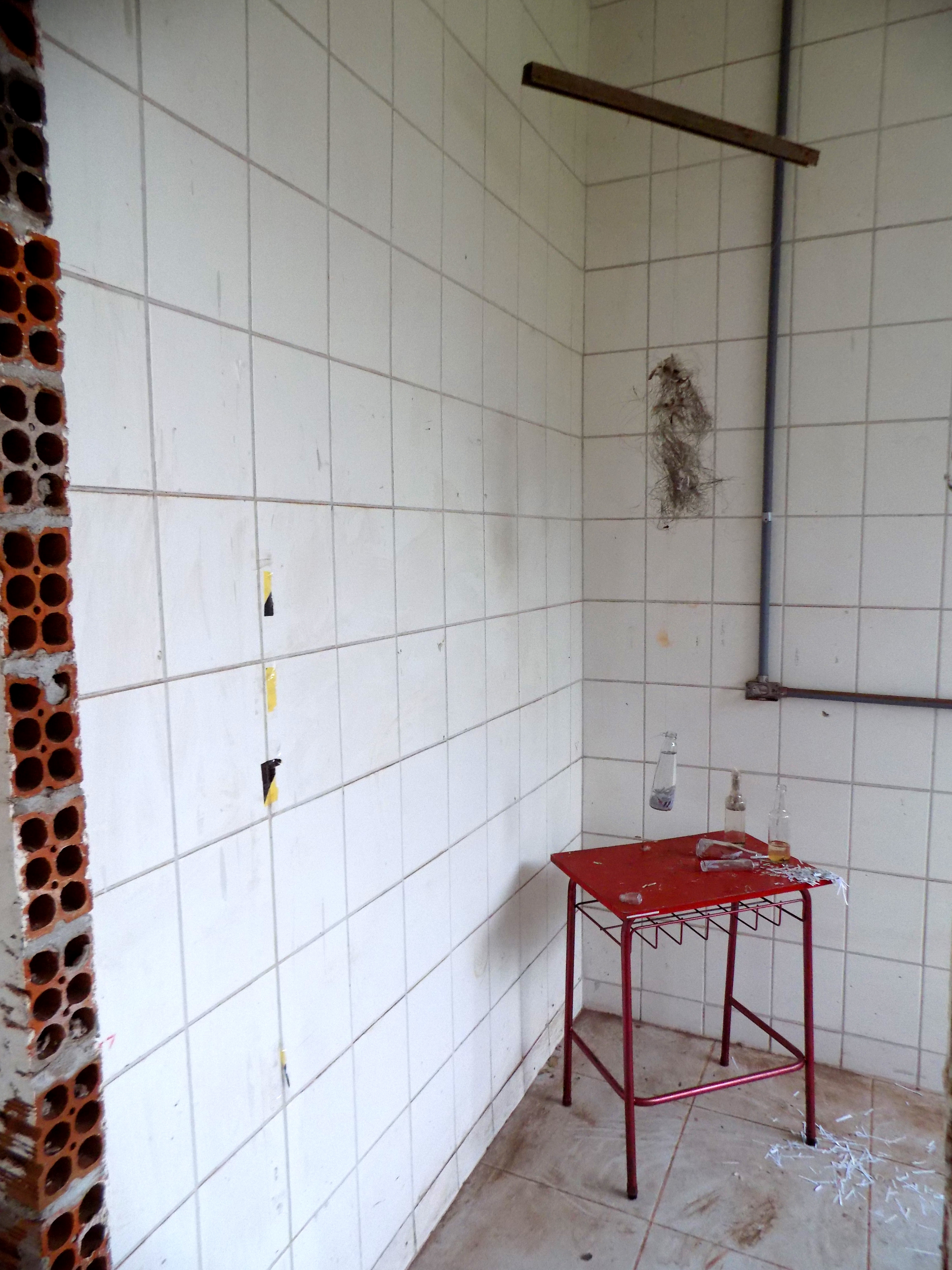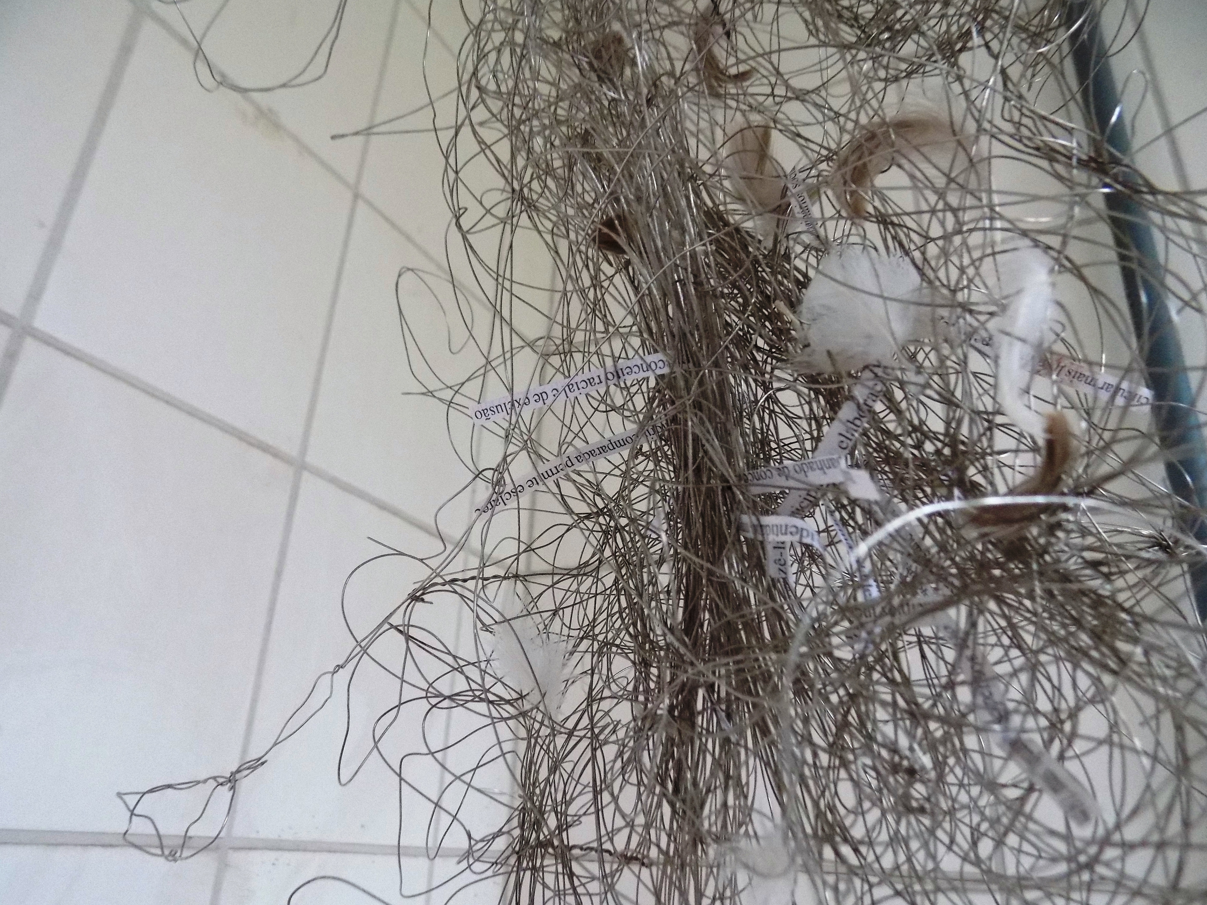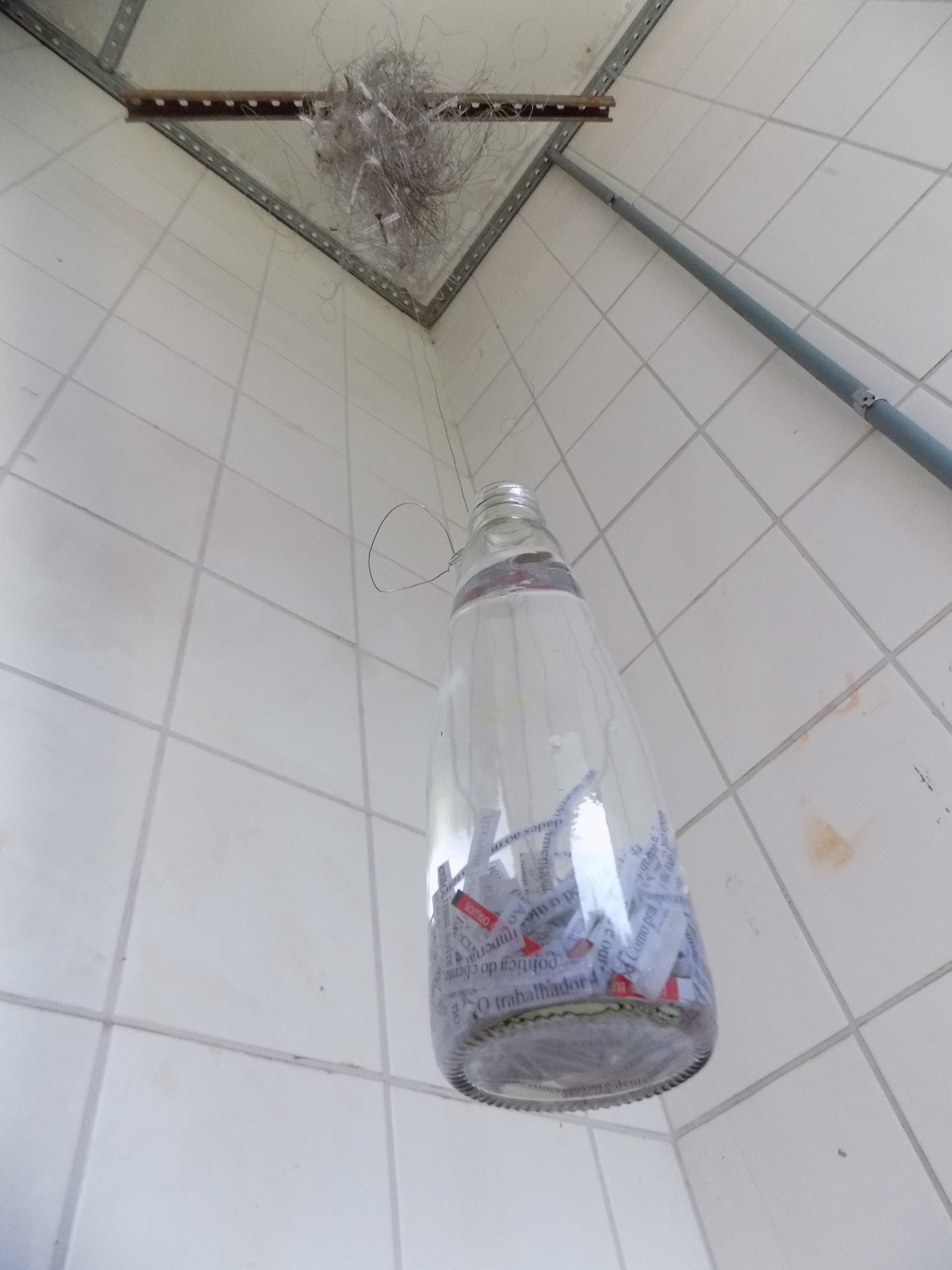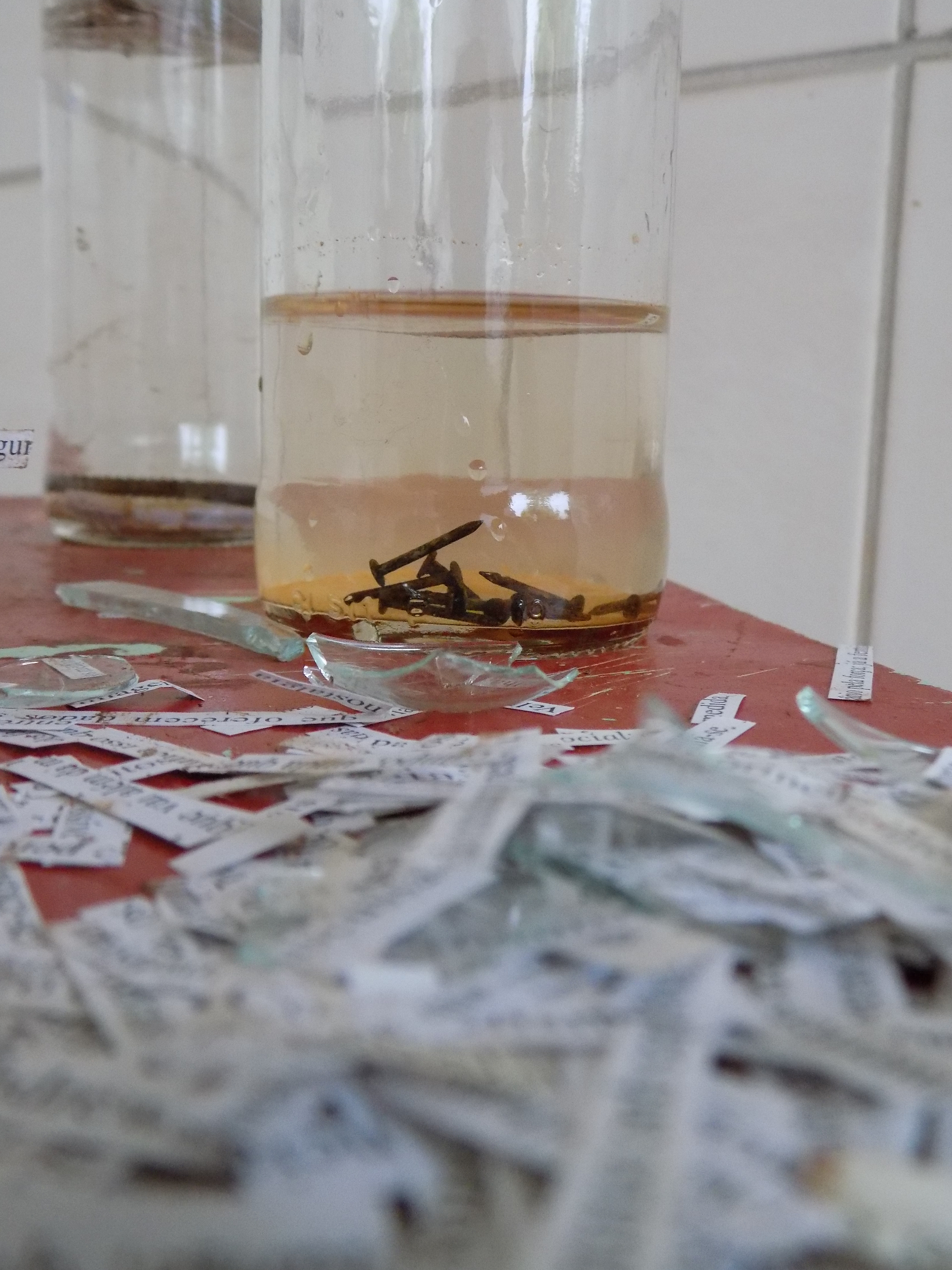 ESPAÇO DESABITADO, MESA, ARAME, GARRAFAS, ÁGUA, PENA, PREGO, ARAME, CACO DE VIDRO, PALAVRAS