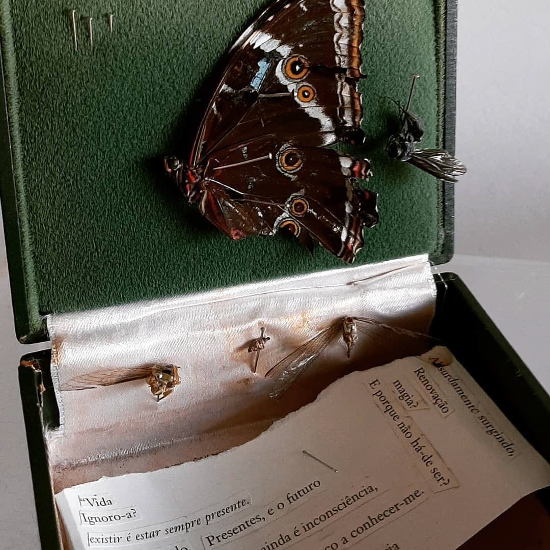 ESPAÇO DESABITADO, FOTOGRAFIA IMPRESSA EM PAPEL VEGETAL, VIDRO QUEBRADO, CADERNOS, LÁPIS, RELATOS, LIVRO, VIDRO, LUPA, INSETOS, NATUREZA MORTA